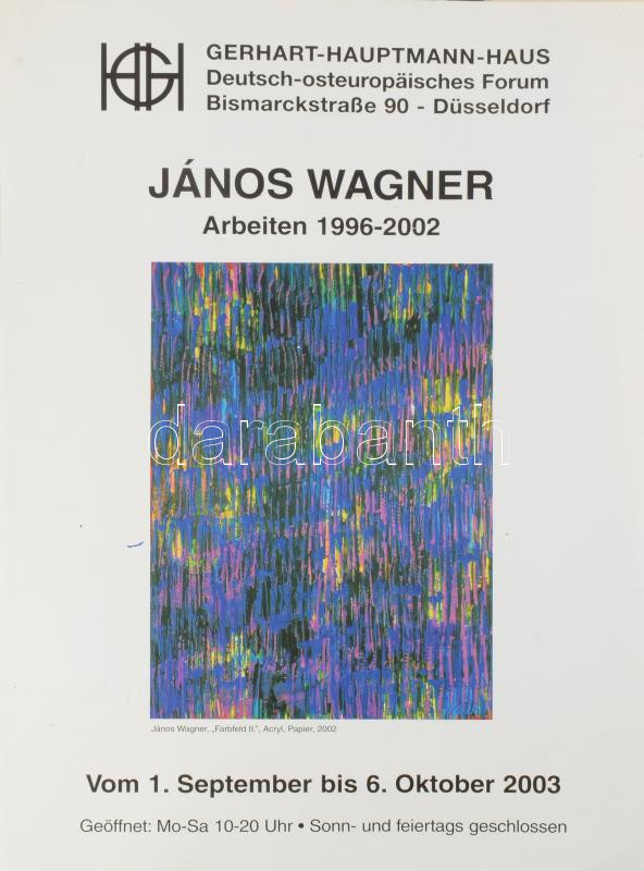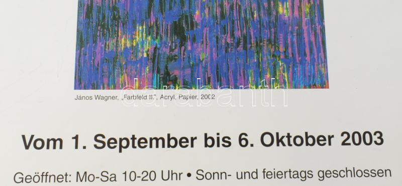 2003 János Wagner, Arbeiten 1996-2002. Gerhart-Hauptmann-Haus, Düsseldorf. Kiállítási Plakát, papír. A plakáton reprodukált "Színmező II." c. Wagner János festmény szerepel kiállításunkon. Apró lapszéli elszíneződéssel. 59,5×42 cm. Ritka!