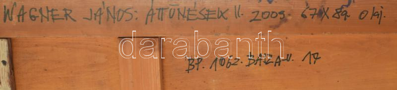 Leírás: Wagner János (1936-2022): Áttűnések II., 2009. Olaj, fa, jelezve balra lent: Wagner. Hátoldalán autográf felirattal. 89x65,5 cm.