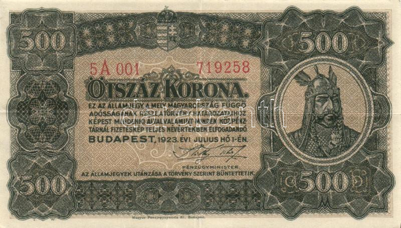 Leírás: 1923. 500K "Magyar Pénzjegy..." T:II-