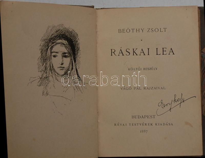 Vágó Pál rajzaival. Bp. 1887.... https://www.darabanth.com/hu/160-Gyorsarveres/160.0/Festmeny-mutargy-papirregiseg-egyeb/Konyvek-Egyeb-ritkasagok~2000031/Beothy-Zsolt-Raskai-Lea-Koltoi-beszely-3Cbr3EVago-Pal-rajzaival-Bp-1887-Revai-94p-Fe~II510713