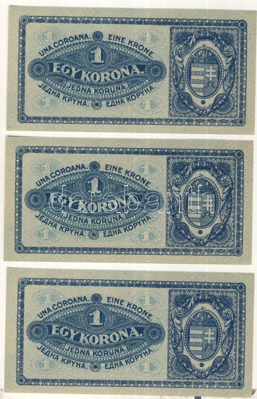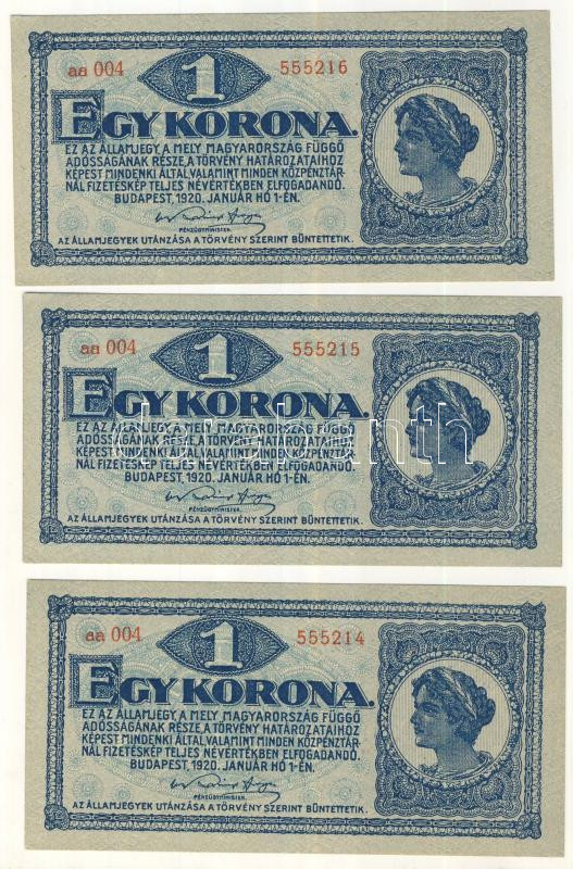 1920. 1K "aa" rozsdavörös (3x) egymás utáni sorszámmal T:I(apró sarokk... https://www.darabanth.com/hu/165-Gyorsarveres/165.0/Numizmatika/Magyar-es-magyar-vonatkozasu-bankjegyek~1400102/1920-1K-aa-rozsdavoros-3x-egymas-utani-sorszammal-TIapro-sarokkopas~II544795