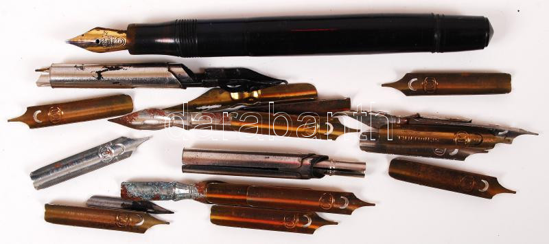 Antik szemüveg és kopott nem hozzávaló tokja, Garant tollhegyek és töltőtoll.