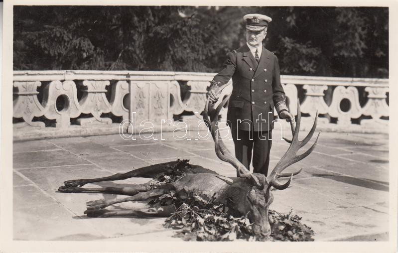 Horthy Miklós kormányzó az általa lőtt szarvasbikával / trophy deer https://www.darabanth.com/hu/191-Gyorsarveres/191.0/Kepeslapok/Uralkodo-Politikus~600126/Horthy-Miklos-kormanyzo-az-altala-lott-szarvasbikaval-trophy-deer~II721242