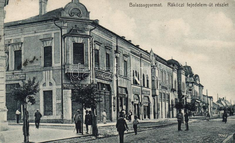 Leírás: Balassagyarmat, Rákóczi fejedelem út, Schönberger Rudolf és Grosz Mór üzletei