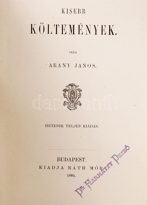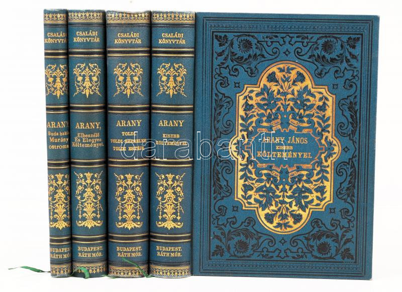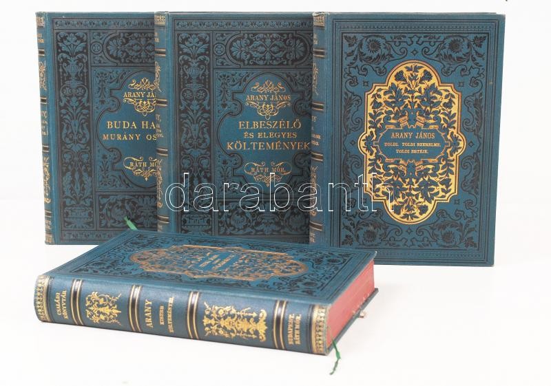 Arany János sorozat 4 kötetben: Toldi szerelme, Toldi estélye. Kisebb költemények, Elbeszélő és elegyes költemények, Buda halála, Murány ostroma. Családi könyvtár sorozat Bp., 1887. Ráth Mór. Egységes, aranyozott egészvászon kötésben, aranyozott lapszélekkel, nagyon szép állapotban