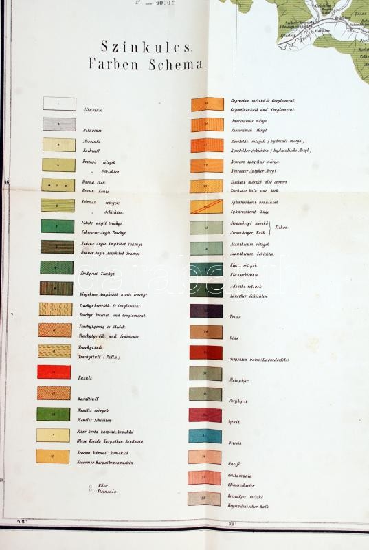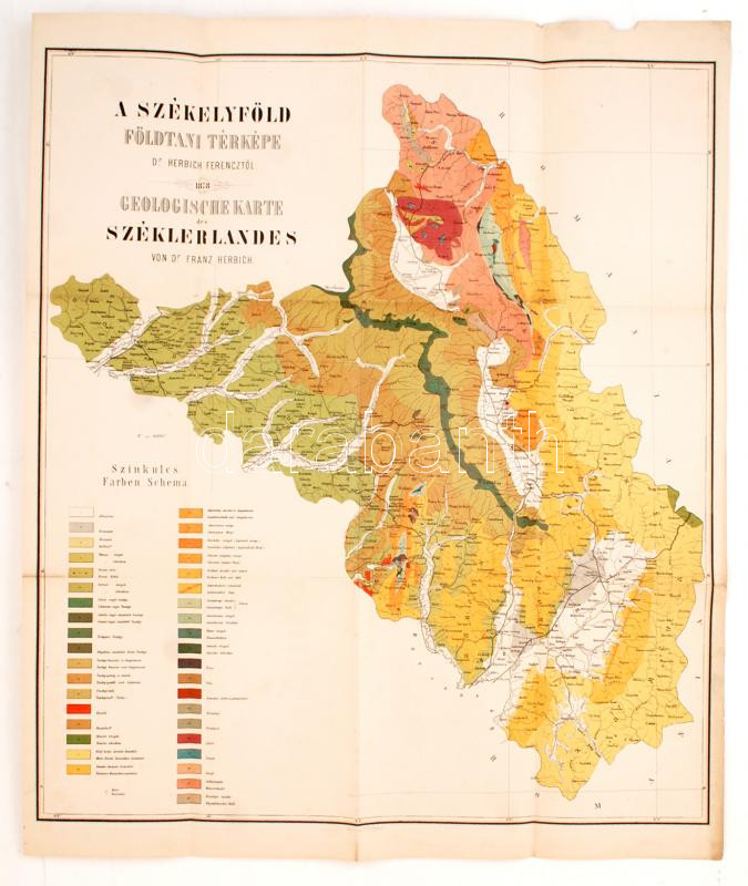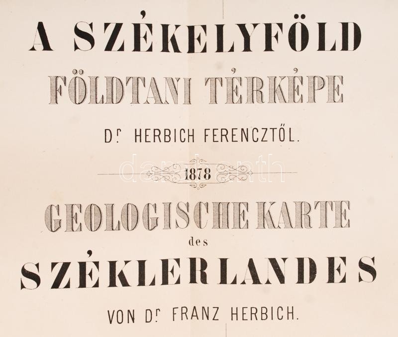 1878 Bp., A Székelyföld földtani térképe, dr. Herbich Ferenctől(Geologische Karte des Széklerlandes von Dr. Franz Herbich), kőnyomatos térkép, alján szín- és jelmagyarázattal, a hajtásoknál kisebb szakadásokkal, 62x75 cm