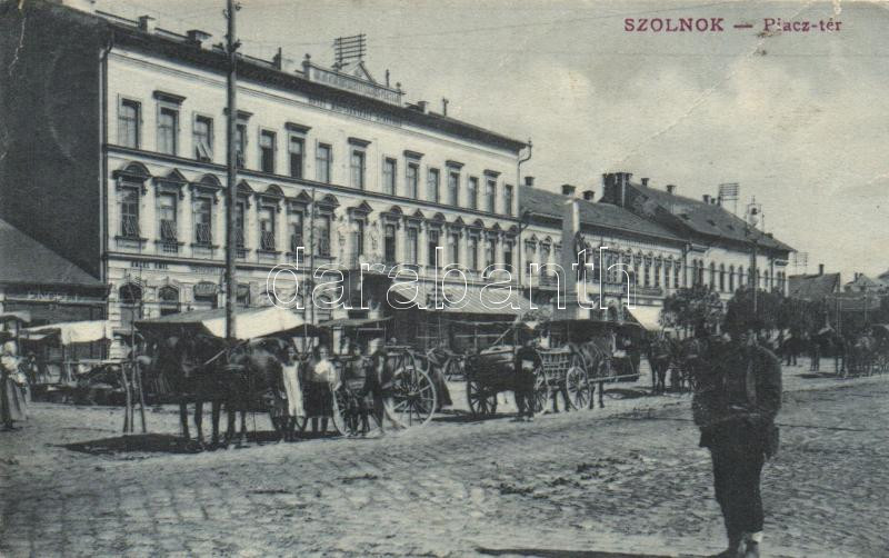 Szolnok, Piac tér, megyei Takarékpénztár, Magyar Király szálloda, Engel Emil boltja, Róth Dezső kiadása (fa)