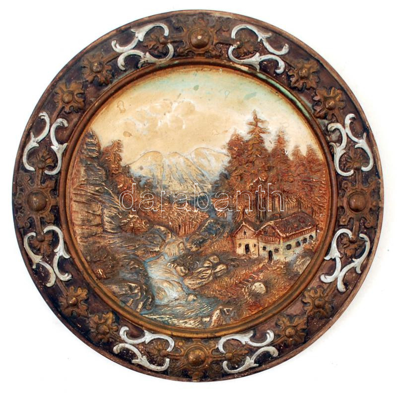 Leírás: Antik, fajansz, fali dísztányér, formába nyomott, kézzel festett, kisebb kopásnyomokkal, d:33cm