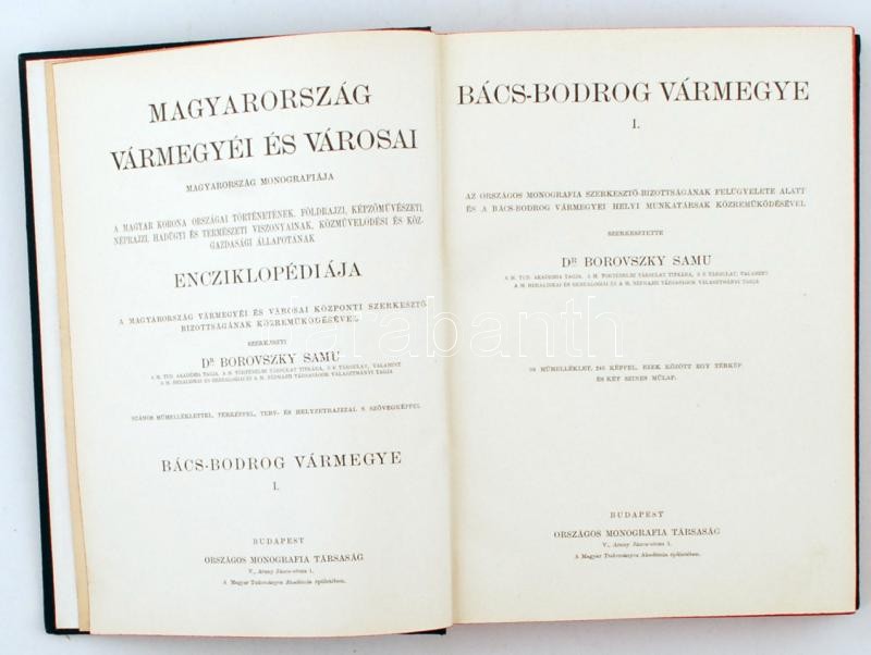 Magyarország vármegyéi és városai. Szerk. Sziklay János - Borovszky Samu. 1-25. köt. Teljes sorozat! Esztergom vármegye két kiadásban is. Kötetei: Abauj-Torna vármegye és Kassa. Bp. 1896. ,,Apollo". Bács-Bodrog vármegye. 1. köt. Bp. (1909), Orsz. Monografia Társ. Bács-Bodrog vármegye. 2. köt. Bp. (1909), Orsz. Monografia Társ. (gerincen apró sérülés, 279. oldal tetején sérült) Bars vármegye. ( Bp. (1903), ,,Apollo". Bihar vármegye és Nagyvárad. Bp. (1901. ,,Apollo". Esztergom vármegye Bp. (1910), Orsz Monografia Társ. (Esztergom várhegy műmelléklet hiányzik) külön és Esztergom vármegye Bp. (1910), Orsz Monografia Társ. (Esztergom várhegy műmelléklet hiányzik) Hozzákötve: Győr vármegye Bp. (1910), Orsz. Monografia Társ. Fiume és a magyar-horvát tengerpart. Bp. (1900), ,,Apollo". Gömör-kishont vármegye Bp. (1903), ,,Apollo". Heves vármegye Bp. (1910), Orsz. Monografia Társ. (hátsó borító kopott, megye térkép alja megragasztva, foltos lapok) Hont vármegye és Selmeczbánya sz. kir. város Bp. (1906), Orsz. Monografia Társ. Komárom vármegye és Komárom sz. kir. város. Bp. (1907), Orsz. Monografia Társ. Nógrád vármegye. Bp. (1911), Orsz. Monografia Társ. Nyitra vármegye. Bp. (1900), ,,Apollo". Pest-Pilis-Solt-Kiskun vármegye. 1. köt. Bp. (1910), Orsz. Monografia Társ. (néhány beleírással) Pest-Pilis-Solt-Kiskun vármegye. 2. köt. Bp. (1910), Orsz. Monografia Társ. Pozsony vármegye. Bp. (1895), ,,Apollo". Somogy vármegye. Szerk. Csánki Dezső. Bp. é. n. Orsz. Monografia Társ. (Gerinc felül javított) Szabolcs vármegye. Bp. (1900), ,,Apollo". Szatmár vármegye. Bp. 1908. Orsz. Monografia Társ. (Gerinc negyede pótolt, előzéklapból szöveget nem érintő hiány) Hozzákötve: Szatmárnémeti sz. kir. város. Bp. (1908), Orsz. Monografia Társ. Temes vármegye. Bp. é. n. Orsz. Monografia Társ. Hozzákötve: Temesvár. Bp. é. n. Orsz. Monografia Társ. Torontál vármegye. Bp. (1911), Orsz. Monografia Társ. Vas vármegye. Bp. 1898. ,,Apollo". Zemplén vármegye és Sátoraljaújhely r. t. város. Bp. é. n. ,,Apollo". Minden kötet rendkívül gazdagon illusztrálva, színes képekkel és térképekkel, a fenti hibákon kívül jó állapotban hiány nélkül. Kiadói, festett, aranyozott, egészvászon-kötésben, változó állapotban. Egy kivétellel piros lapszéllel. Egyben nagyon ritka!