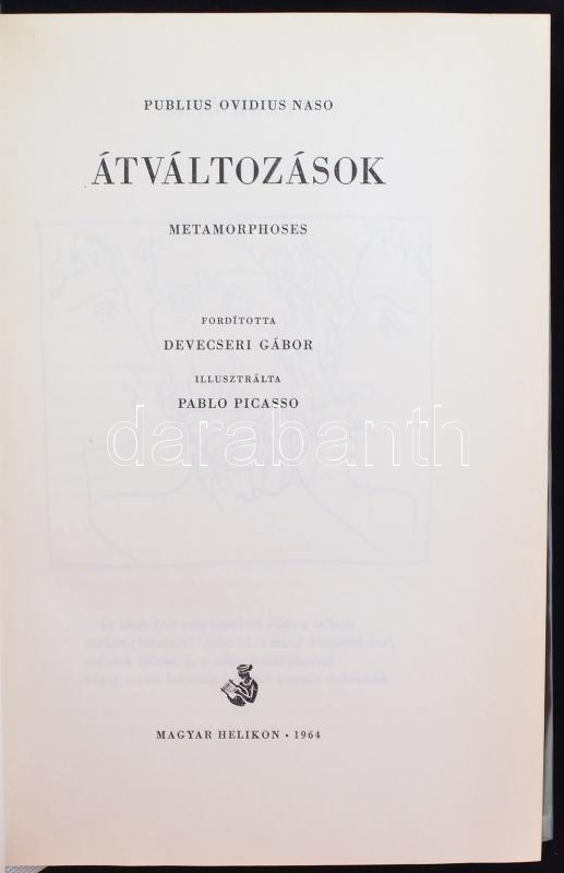 Publius Ovidius Naso: Átváltozások. Metamorphoses. Ford. Devecseri Gáb... https://www.darabanth.com/hu/24-Nagyaukcio/24.1/Mutargy-papirregiseg/Konyvek-Egyeb-ritkasagok~9338/Publius-Ovidius-Naso-Atvaltozasok-Metamorphoses-Ford-Devecseri-Gabor-Illusztralta-Pablo-Pi~II1220018