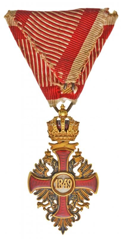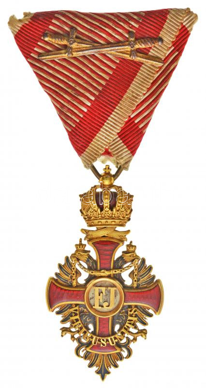 1916. "Ferenc József-rend lovagkeresztje hadidíszítménnyel, kardokkal" jelzett Au kitüntetés "FR (Firma Rothe)" gyártói jelzéssel, függesztőkarika lecserélve, hátoldali medalion zárólemeze nem nyílik T:2 a kereszt alján kis sérült rögzítés Hungary 1916. "Order of Franz Joseph, Knight's Cross with a war decoration and swords" hallmarked Au decoration with makers mark "FR (Firma Rothe)", suspension ring replaced, the back medallion doesn't open C:XF small damaged fixation on the bottom of the cross NMK 210.