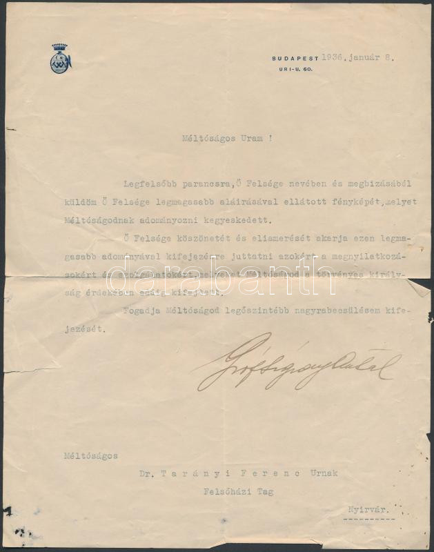1936 gróf Sigray Antal (1879-1947) legitimista politikus aláírt köszönőlevele, melyben Habsburg Ottó trónörökös köszönetét tolmácsolja Tarányi Ferenc felsőházi tagnak, a királyság visszaállítása ügyében tett felszólalásai miatt.