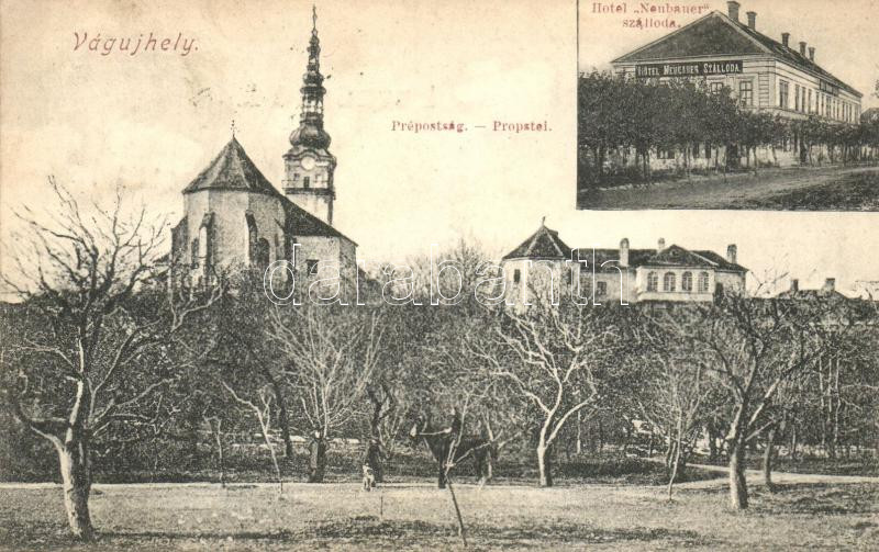 Leírás: Vágújhely, Nové Mesto nad Váhom; Neubauer szálloda, prépostság, Brück Gyula felvétele és kiadása / hotel, church