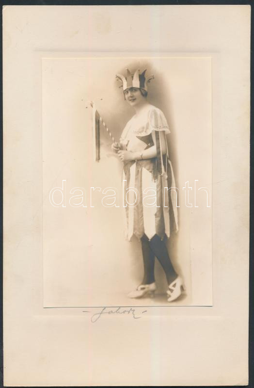 Leírás: cca 1920-1930 Hölgy jelmezben, kartonra kasírozott, jelzett fotó Labori műterméből, 17x11 cm, karton 25x16 cm