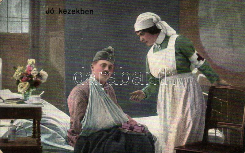 'Jó kezekben' / Injured Hungarian soldier is taken care by nurse (kopo... https://www.darabanth.com/hu/252-Gyorsarveres/252.0/Kepeslapok/Katonai~200086/Jo-kezekben-Injured-Hungarian-soldier-is-taken-care-by-nurse-kopott-sarkak-worn-edges~II1221251