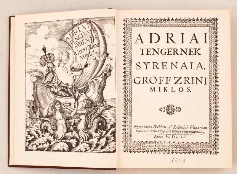Zrínyi Miklós: Adriai tengernek Syrenaia. Hasonmás kiadás. Bp. 1980, Akadémiai Kiadó. Kovács Sándor Iván kísérőtanulmányával. Kiadói bőrkötésben, védőtokban. Kiváló állapotban. A tokon és a tanulmány címlapján bejegyzések.