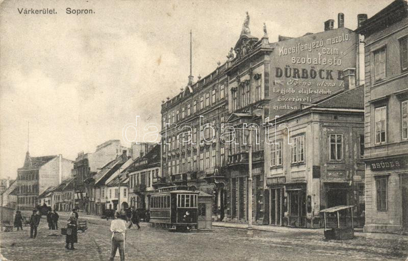 Leírás: Sopron, Várkerület, Dürböck és Brüder üzlete, villamos, kiadja Kummert L. (EK)