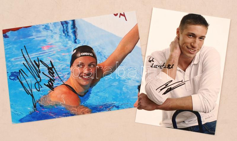 Berki Krisztián (1985-) olimpiai bajnok, háromszoros világbajnok és hatszoros Európa-bajnok magyar tornász aláírása fotón, 12x18cm/ Hosszú Katinka (1989-) ötszörös világbajnok magyar gyors- és vegyes úszó, olimpikon aláírása fotón, 12x18cm