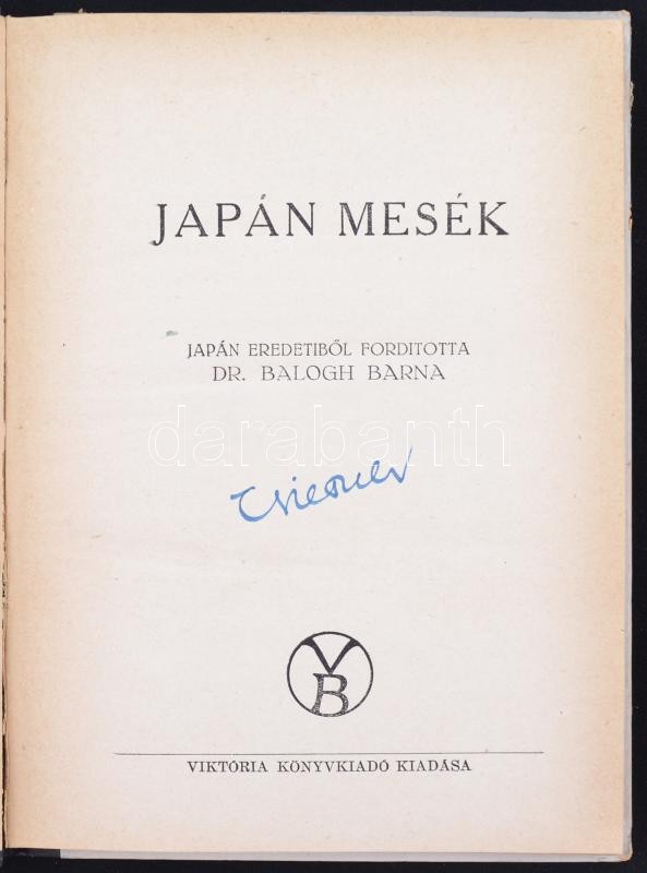 Japán mesék. Japán eredetiből fordította dr. Balogh Barna. Bp., 1943, ... https://www.darabanth.com/hu/259-Gyorsarveres/259.0/Konyvek/Konyvek-Egyeb-ritkasagok~40/Japan-mesek-Japan-eredetibol-forditotta-dr-Balogh-Barna-Bp-1943-Viktoria-142-p-Kiadoi~II1272638