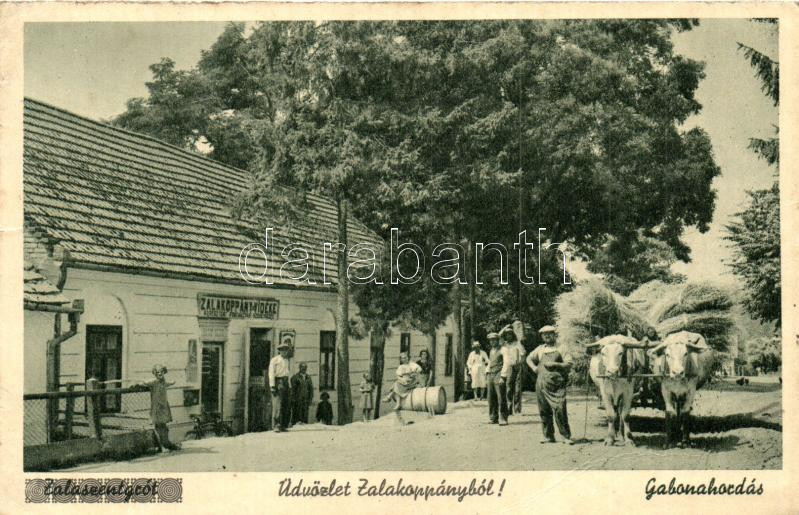 Zalakoppány (Zalaszentgrót); utcakép gabonahordó ökrös szekerekkel, fogyasztási szövetkezet (EK)