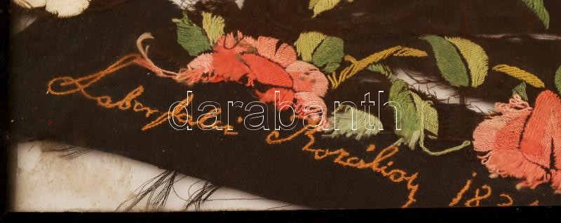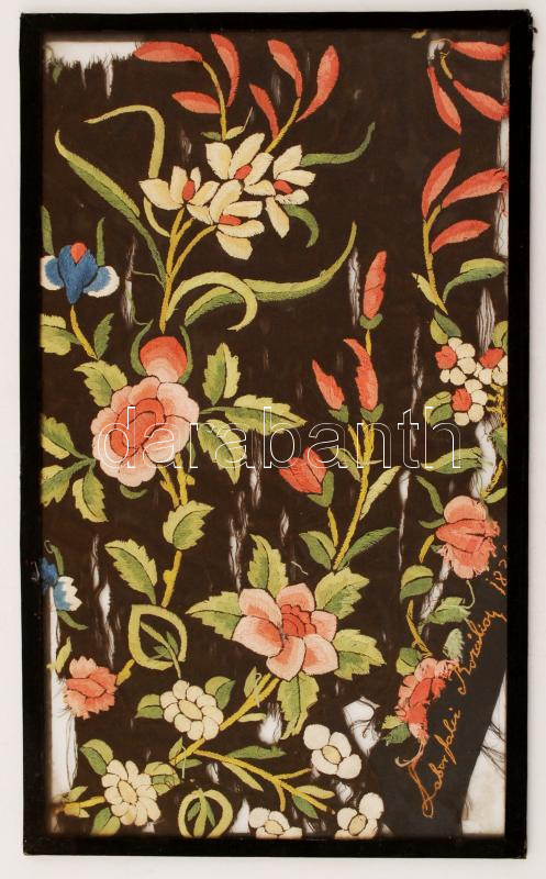 1835 Jókainé Laborfalvi Róza (1817-1886) által készített, nevével kihímzett virágos szövet üveglapok között, Jókainé kedvelt szórakozása közé tartozott a hímzés. A tétel Jókai Mór rokonának hagyatékából kerül árverésre, provenienciája igazolt és az érdeklődő rendelkezésére áll. A tételhez tartozik Laborfalvi Rózáról készített nyomat bekeretezve, hátoldalt keresztlányának, Hegedűs Rózsikának feljegyzésével 35x22 cm