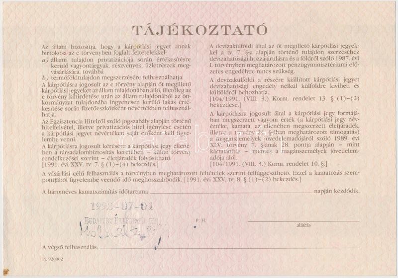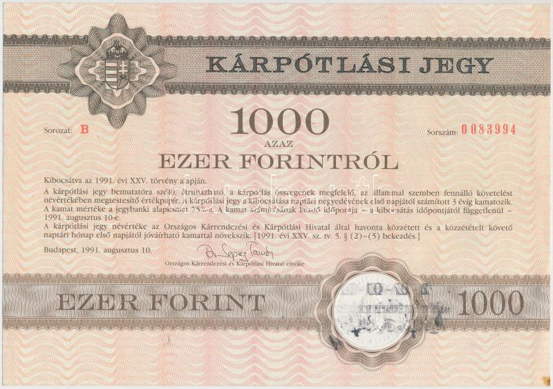 Leírás: Budapest 1991. "Országos Kárrendezési és Kárpótlási Hivatal" kárpótlási jegye 1000Ft-ról, "B" sorozat T:I-