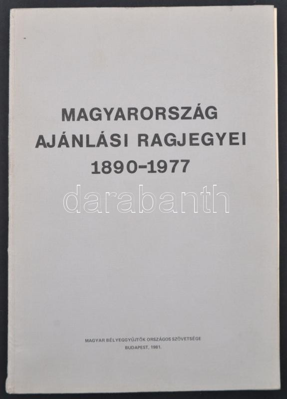 Magyarország ajánlási ragjegyei 1890-1977 (Budapest, 1981) https://www.darabanth.com/hu/268-Gyorsarveres/268.0/Festmeny-mutargy-papirregiseg-egyeb/Parafilatelia~25/Magyarorszag-ajanlasi-ragjegyei-1890-1977-Budapest-1981~II1345366