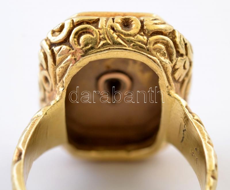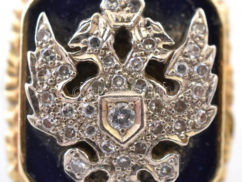 Leírás: Arany (18 K) gyűrű orosz cári címerrel, gyémánt és brill kövekkel kirakva, zománc berakással, jelzett, bruttó:23,95 g, méret:65 / Gold ring, with Russian tsar coat of arms, diamond and brill gems, hallmarked