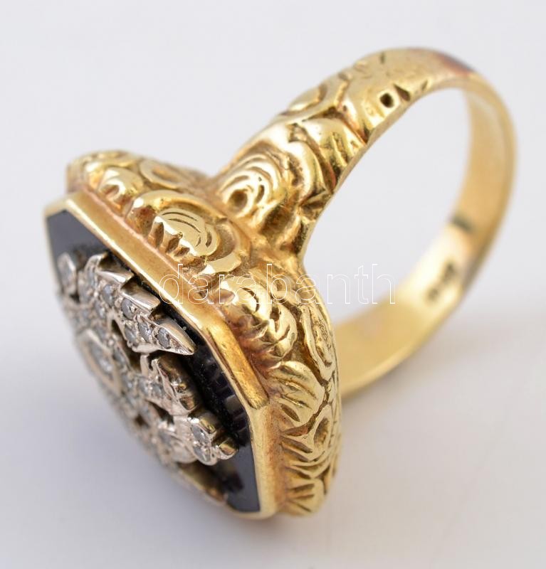 Arany (18 K) gyűrű orosz cári címerrel, gyémánt és brill kövekkel kira... https://www.darabanth.com/hu/27-Nagyaukcio/27.1/Festmeny-mutargy-papirregiseg-egyeb/Nemesfem-Disztargyak-Orak-es-Ekszerek~11151/Arany-18-K-gyuru-orosz-cari-cimerrel-gyemant-es-brill-kovekkel-kirakva-zomanc-berakass~II1532142