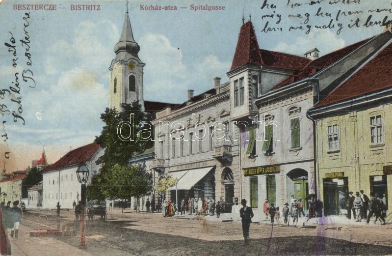 Beszterce, Bistritz, Bistrita; Kórház utca, Bartha Mária üzlete, Sahli... https://www.darabanth.com/hu/27-Nagyaukcio/27.1/Kepeslapok/Erdely~10795/Beszterce-Bistritz-Bistrita-Korhaz-utca-Bartha-Maria-uzlete-Sahling-szalloda-Spitalgasse~II1550977