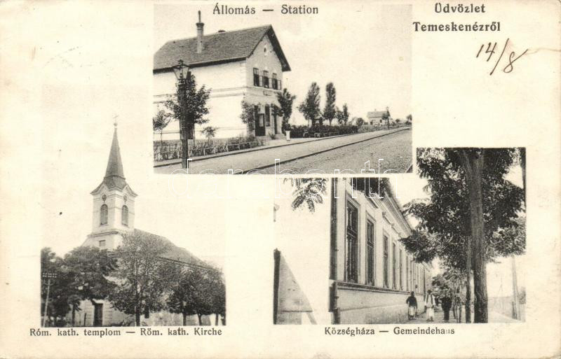 Leírás: Temeskenéz, Satchinez; vasútállomás, római katolikus templom, községháza / railway station, church, town hall (Rb)