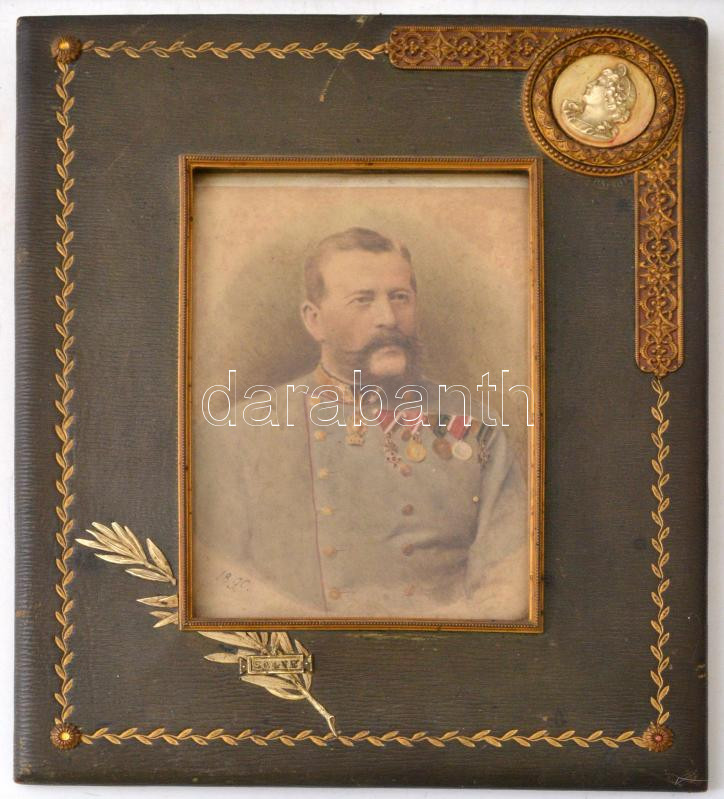 1890 Magasrangú katonatiszt kabinet fotója (feltehetőleg Arad rendőfönöke ?), korabeli csontberakással, és rézveretekkel díszített vászon képkeretben, néhol foltos, kopott, de alapvetően szép állapotban, 24x20 cm., 11x16 cm. / 1890 Cabinetphoto of a high standing military officer,(Maybe he was the chief constable of Arad), linen frame with bone inlay and coppering, with some spotty and worn, but the other things are okay, 24x20 cm., 11x16 cm.