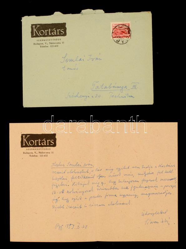 1959 Simon István (1926-1975) költő, műfordító, szerkesztő kézzel írt recenziója a Kortársnak beküldött versekről, saját kezű aláírással, eredeti levélborítékban