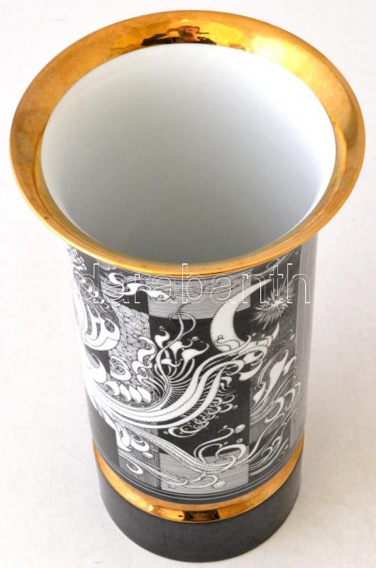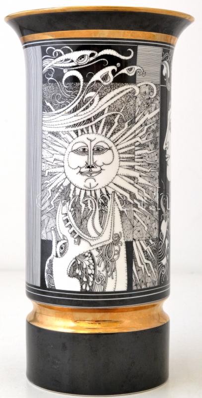 Hollóházi Szász Endre által tervezett mintával díszített porcelán váza, matricás, hibátlan, jelzett, m: 25,5 cm