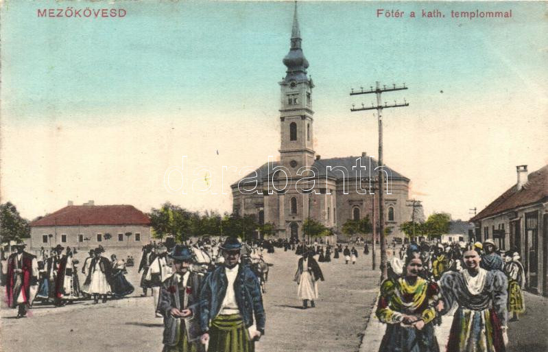 Leírás: Mezőkövesd, Fő tér, Katolikus templom, folklór, W. L. Bp. 2563. (EK)