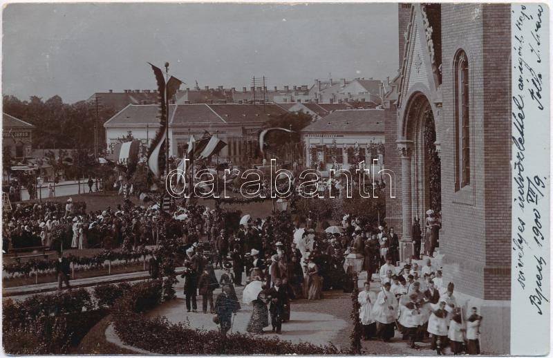 Leírás: 1900 Budapest X. Kőbánya, Szent László plébánia templom, felszentelési ünnepség, Rákóczy kávéház, Grün József üzlete, Wastl Károly vendéglője, photo