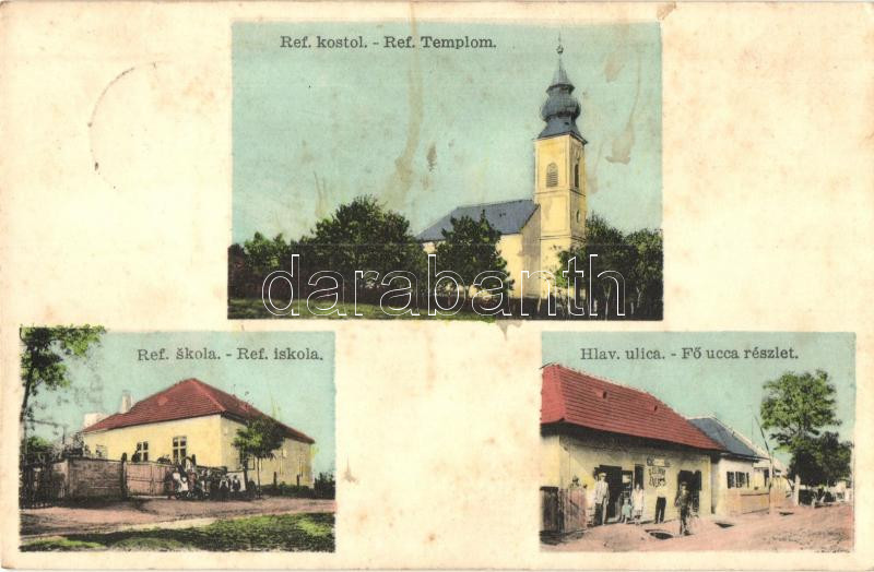 Leírás: Újlót, Lót, Velké Lovce; Református templom és iskola, Fő utca / school, church, main street (fl)