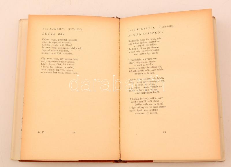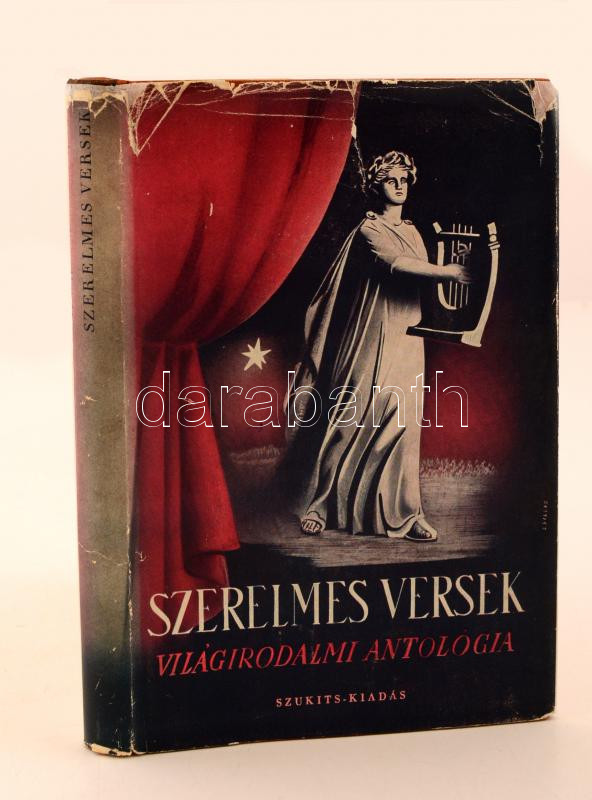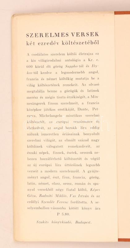 Szerelmes versek. Világirodalmi antológia két ezredév költészetébÅ‘l. Képes Géza, Radnóti Miklós, Szemlér Ferenc, Vas István műfordÃtásai. Budapest, 1941, Szukits. ElsÅ‘ kiadás. Kiadói egészvászon kötés, kiadói kissé szakadozott papÃrborÃtóban. A kötés Kner Erzsébet terve, a borÃtólap B. Csillag Vera munkája. A könyvben Radnóti Miklós ex libriszével. Jó állapotban.