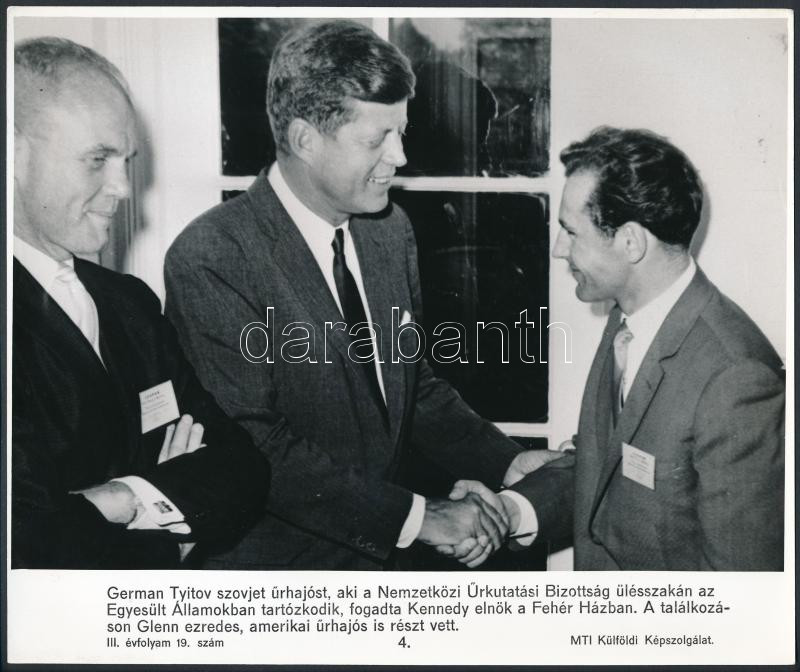Kennedy elnök és German Tyitov szovjet űrhajós, MTI fotó, feliratozva,... https://www.darabanth.com/hu/280-Gyorsarveres/280.0/Festmeny-mutargy-papirregiseg-egyeb/Foto~19/Kennedy-elnok-es-German-Tyitov-szovjet-urhajos-MTI-foto-feliratozva-18-5C39727-cm~II1442797