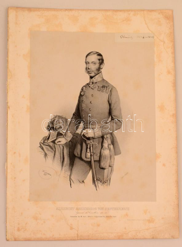 1851 Habsburg-Tescheni Albert Frigyes Rudolf főherceg - Erzherzog Albrecht Friedrich Rudolf von Österreich-Teschen) (1817-1895) osztrák herceg, nagyméretű kőnyomatos portréja. Josef Kriehuber jelzett kőrajza. Képet nem érintő szakadással / 1851 Erzherzog Albrecht Friedrich Rudolf von Österreich-Teschen Austrian prince Large lithographic image. Josef Kriehuber signed. Page size: 37x48 cm With a tear.