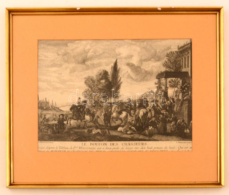 cca XVIII. század második fele: Le boufon des chasseurs, Jean Moyreau (1690-1762) után metszette: P. Wowermens - I. Wachsmouth, rézmetszet, papír, paszpartuban, üvegezett fa keretben, körbevágva (?), a fa kereten kisebb sérülésekkel, 19x28.5 cm. / cca second part of the XVIII. century Le boufon des chasseurs, etched by P. Wowermens - I. Wachsmouth after Jean Moyreau (1690-1762), copper engraving, paper, in paspartu, in woodframe, cut it around (?), with some little damages on the frame, 19x28.5 cm.