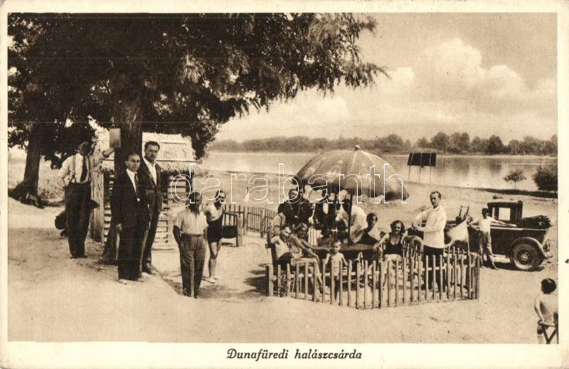 Leírás: Dunafüred, Százhalombatta; halászcsárda, hátoldalán Dunafüred parcellázás reklám