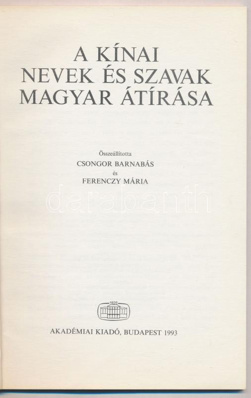 A kínai nevek és szavak magyar átírása. Összeállította Csongor Barnabás és Ferenczy Mária. Bp., 1993, Akadémiai Kiadó. Kiadói papírkötés. Jó állapotban.