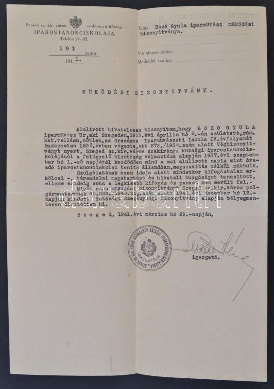 1941 Bozó Gyula képeslap tervező részére Szegeden kiállított működési bizonyítvány.