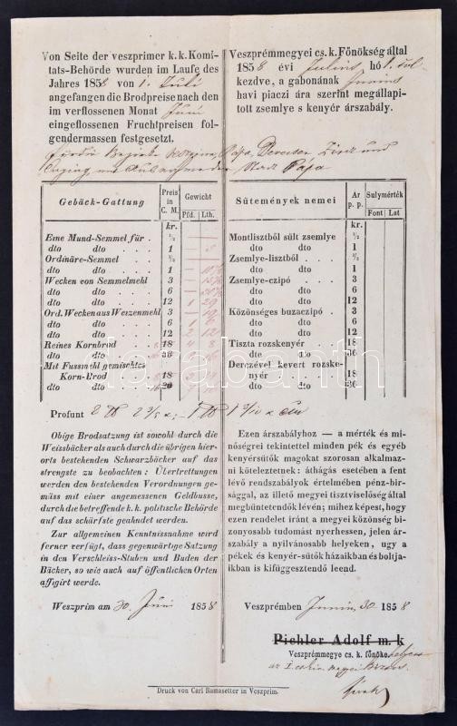 Leírás: 1858 Veszprém, Hirdetmény pápai és veszprémi kenyér- és gabonaárakról