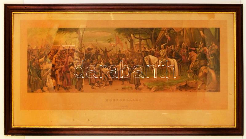 cca 1896 Munkácsy Mihály (1844-1900). Honfoglalás. Színes chromolitográfia. Kiadta Könyves Kálmán Rt. Nagyméretű litográfia. Üvegezett fa keretben. Keret sarkán kis sérülés 87 x 34 cm. / Settlement of the Magyars in Hungary. Large lithography 87x34 cm In glazed frame.