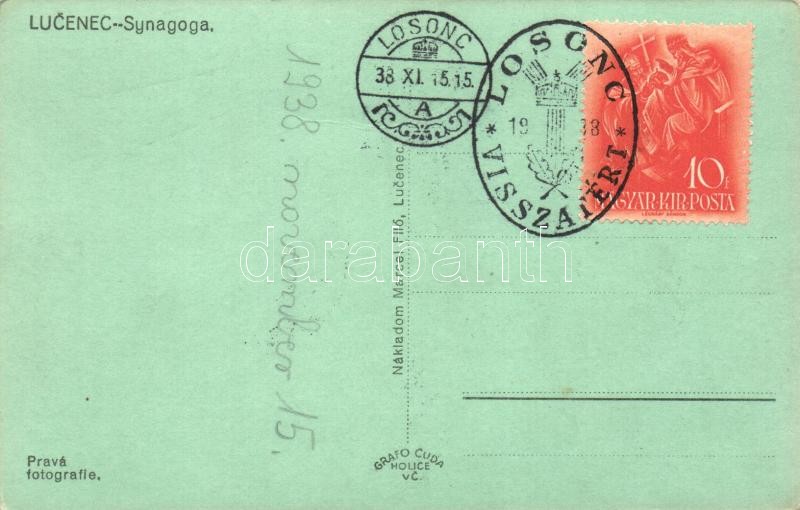 Leírás: 1938 Losonc, Lucenec; zsinagóga / Synagoga / synagouge. Pravá fotografie "1938 Losonc visszatért" So. Stpl