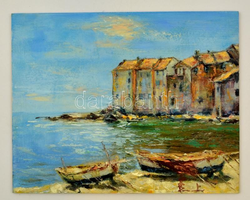 Olvashatatlan jelzéssel: Halászházak, olaj, farost, 20×25 cm