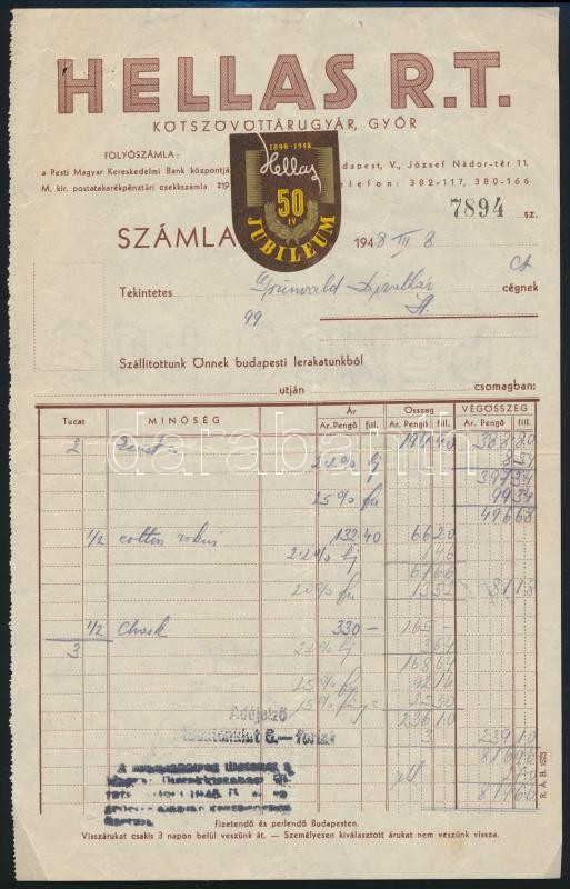 1948 Győr, Hellas Rt. kötszövöttárugyár díszes fejléces számlája, 29x1... https://www.darabanth.com/hu/293-Gyorsarveres/293.0/Festmeny-mutargy-papirregiseg-egyeb/Okmanyok~200017/1948-Gyor-Hellas-Rt-kotszovottarugyar-diszes-fejleces-szamlaja-29x18-cm~II1551115