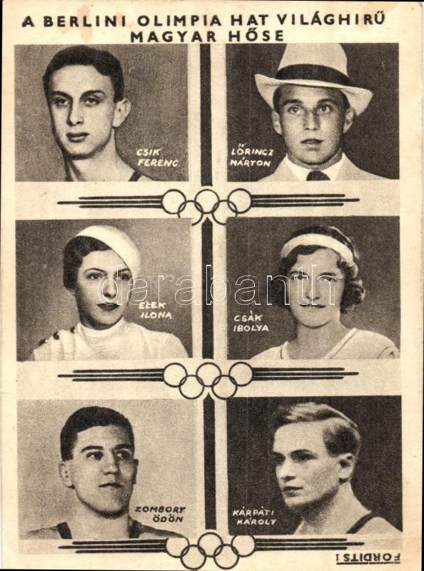 1936 A Berlini Olimpia hat világhírű magyar hőse; Csík Ferenc, Lőrincz Márton, Elek Ilona, Csák Ibolya, Zombory Ödön és Kárpáti Károly. Tolna Világlapja / Hungarian champions in the 1936 Summer Olympics, Berlin (EK)